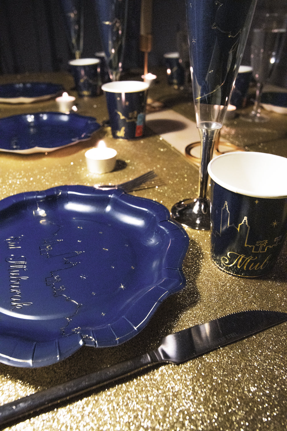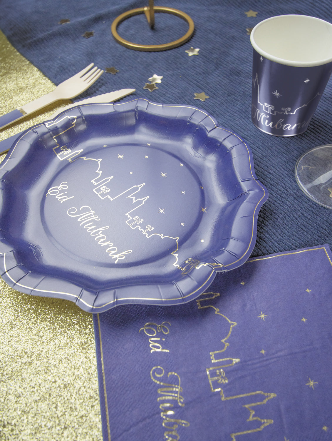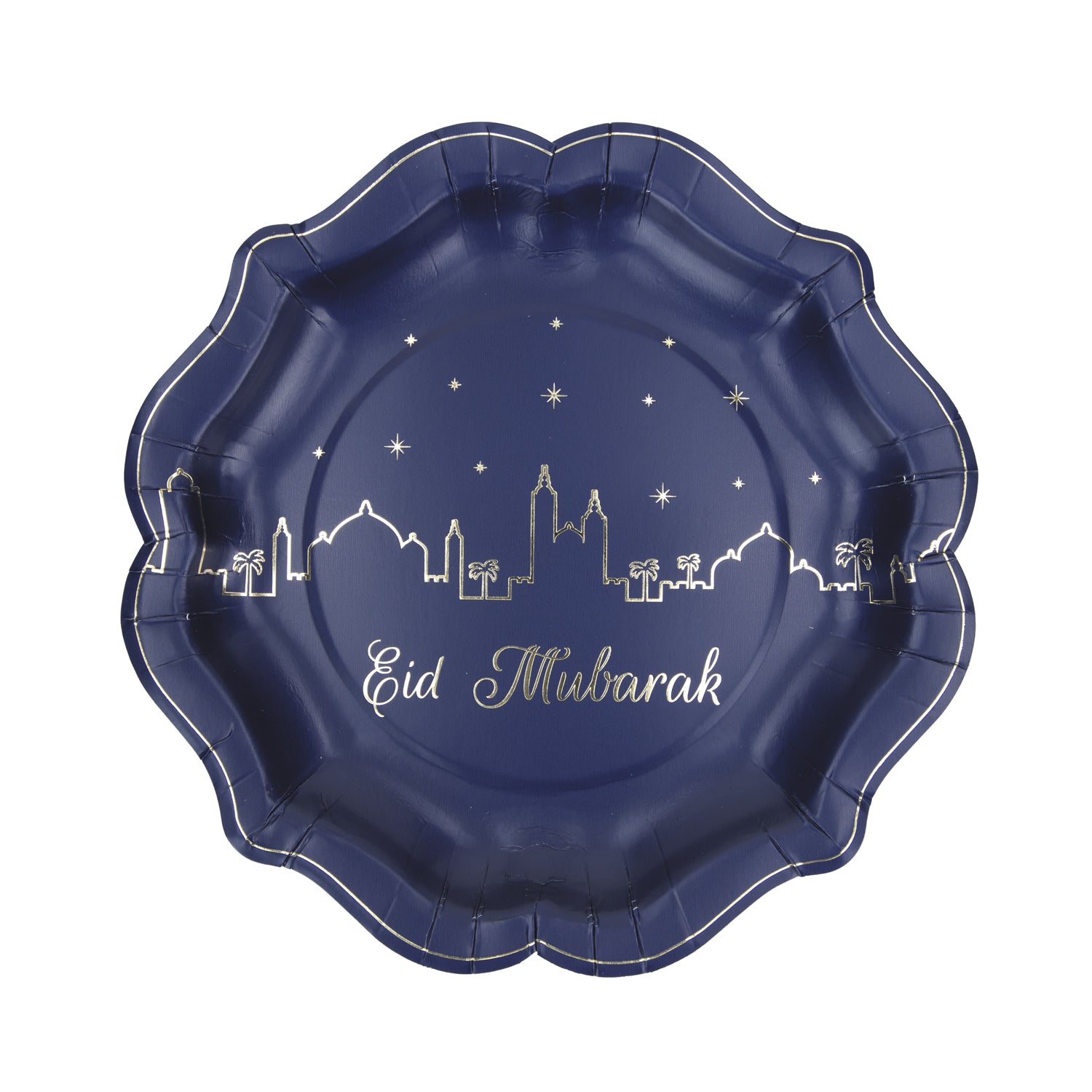 Jolies assiettes 350gr forme façon porcelaine 21 x 21,5cm avec un galon doré, et lettres dorées "Eid Mubarak"